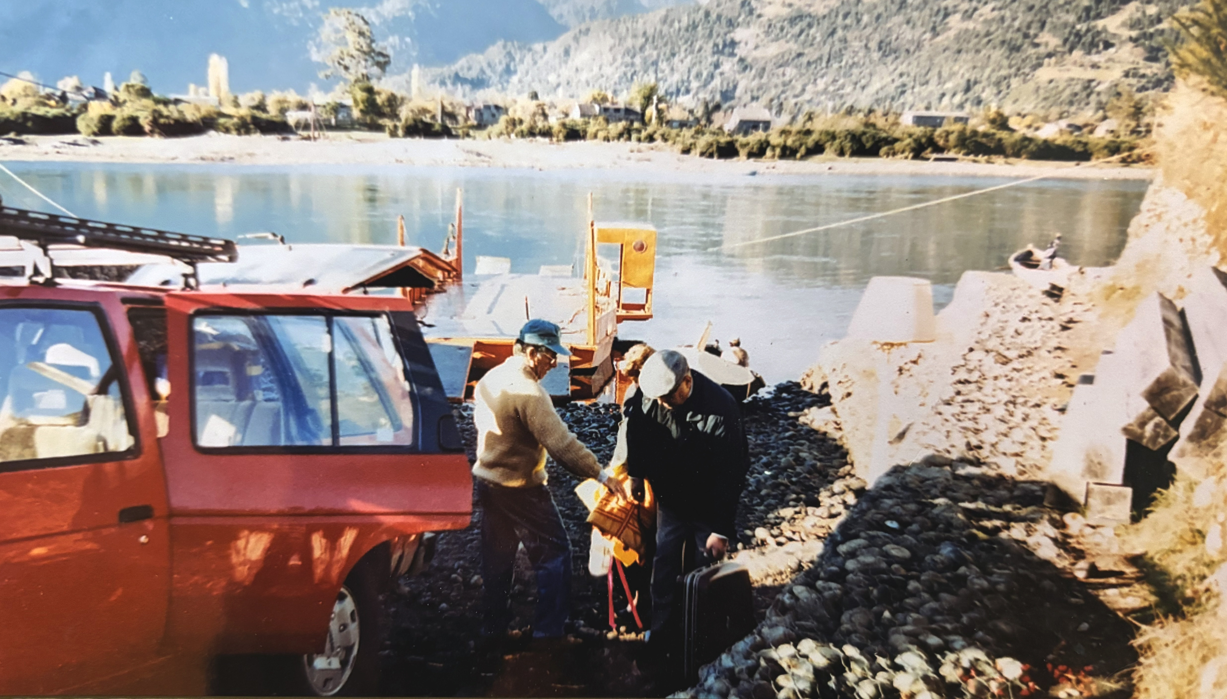 Escena cotidiana de transbordo vehicular y de pasajeros previo a la construcción del puente definitivo. La fotografía captura la logística del cruce en balsa: la espera en la orill...