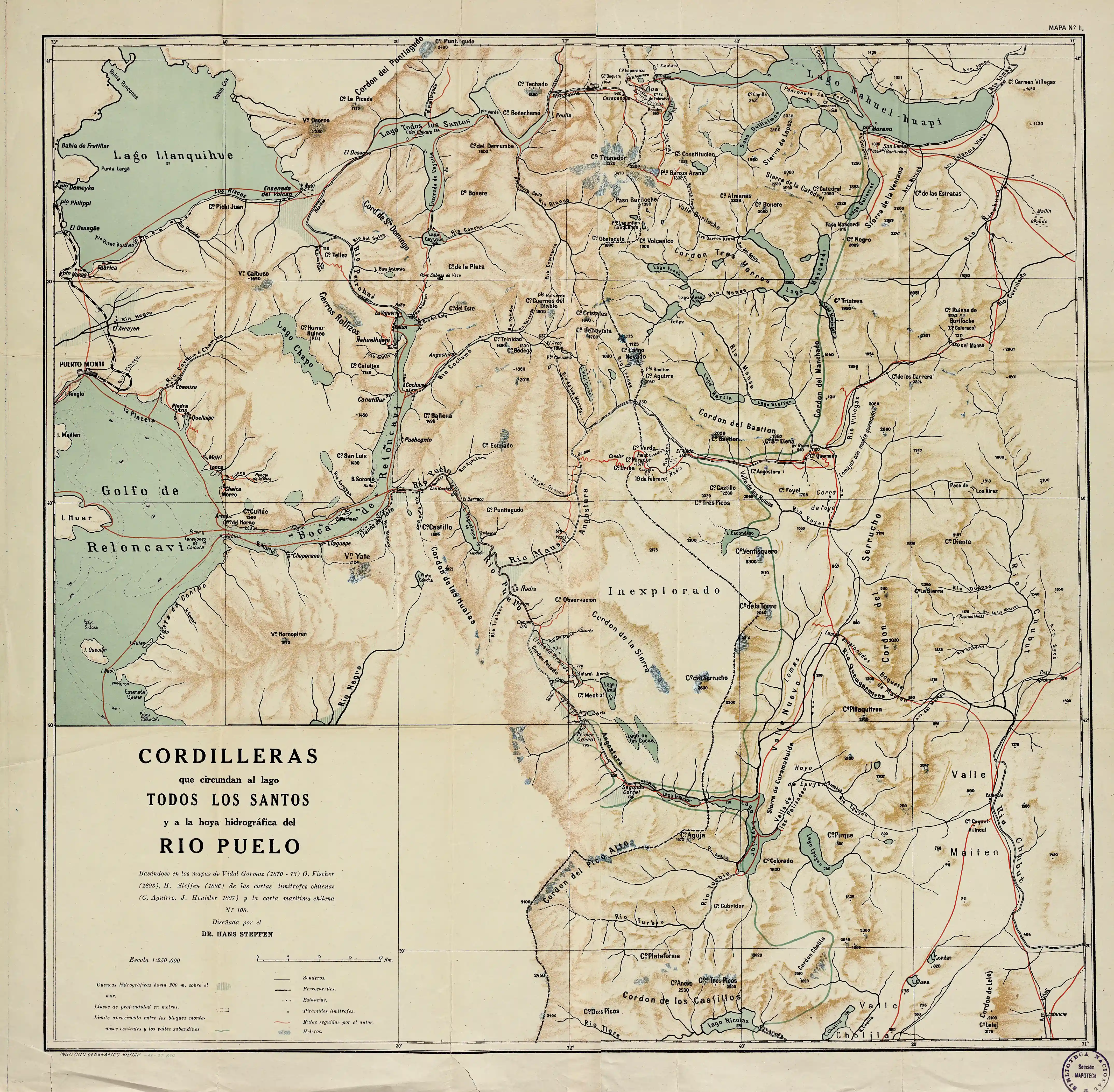 Mapa histórico elaborado a partir de las exploraciones del geógrafo alemán Hans Steffen. Este documento fue fundamental para el reconocimiento de los afluentes, cordones montañosos...