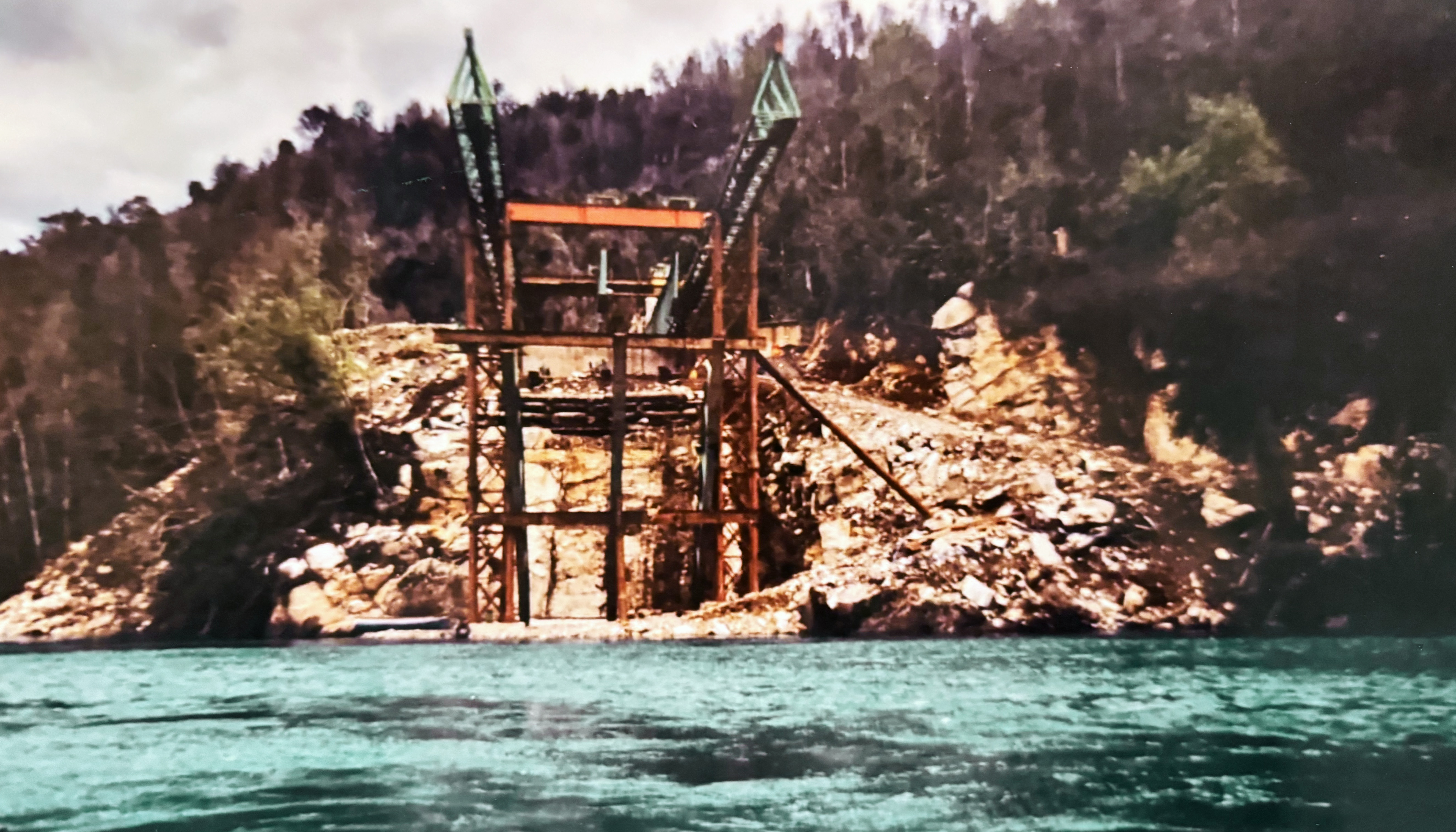 Registro del proceso constructivo de la infraestructura vial que reemplazaría el sistema de balsas. Se aprecian las fundaciones y pilares de acero y hormigón en plena ejecución....