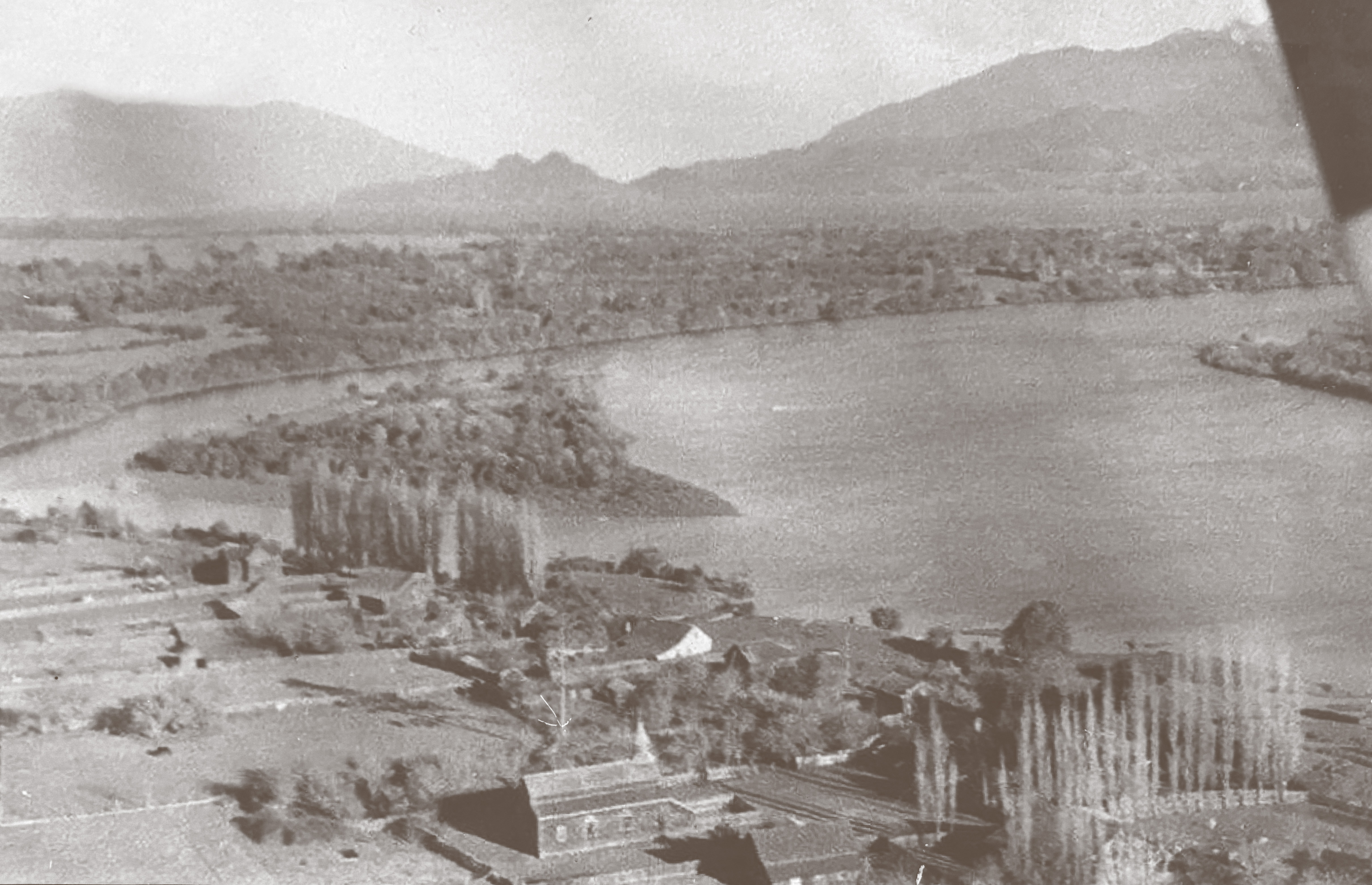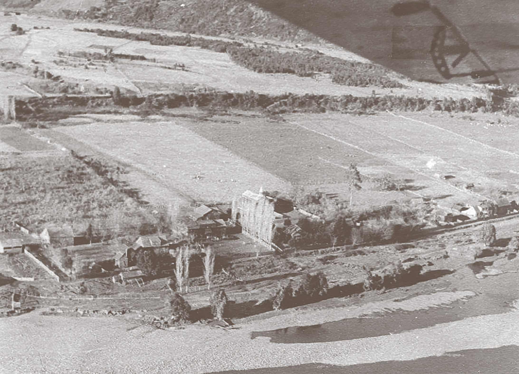 Registro aéreo que documenta la distribución histórica del pueblo. Se aprecia el patrón de asentamiento rural disperso, caracterizado por cercos que delimitan las áreas de cultivo ...